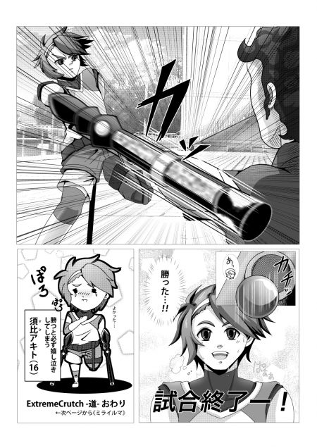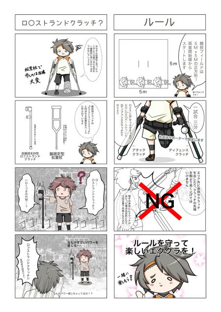 第一回 超人スポーツハッカソンにてチーム・エククラが制作した松葉杖を使った新競技「ExtremeCrutch」を漫画化した作品。