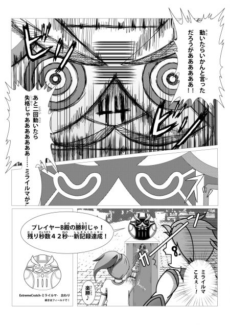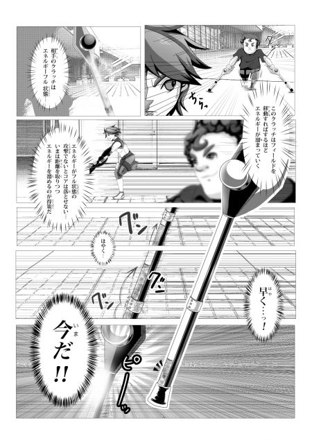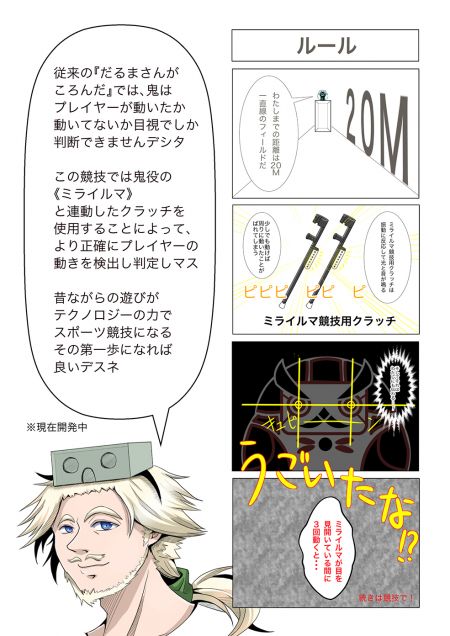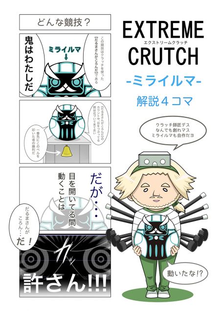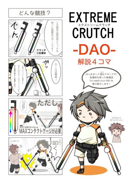 クラッチでチャンバラを行うExtremeCrutch-DAO-と、クラッチでだるまさんがころんだを行うExtremeCrutch- ミライルマ-の2種類があります。誰も見たことのない新競技のルールを説明するには漫画が最適と考え、まだ実際に実現していない部分も作中で表現しています。