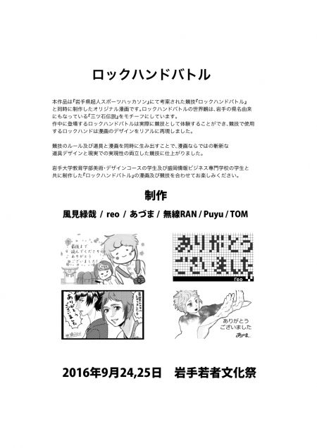 岩手発・超人スポーツプロジェクトにて開発したご当地超人スポーツ「ロックハンドバトル」を元に漫画を作成した本作品。競技版ロックハンドバトル のルール設定や競技道具作成と並行してストーリーの作成やデザインを行う挑戦をしました。