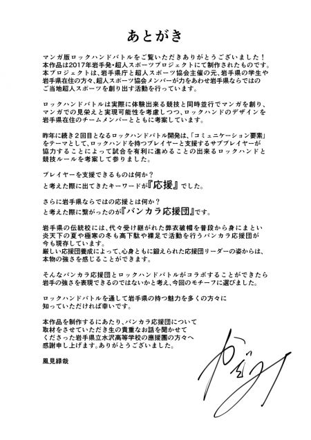 昨年に引き続き、岩手発・超人スポーツプロジェクトにて開発した「ロックハンドバトル」をもとに漫画を制作した本作品。2016年版とは別のストーリーとなっています。